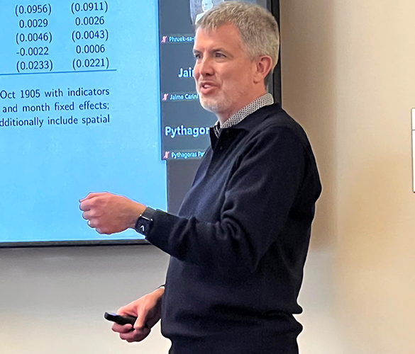 The Vincent and Elinor Ostrom Memorial Lecture was established in 2015 to honor and celebrate the life and work of the Ostroms. The 2022 lecture was provided by Scott Gehlbach, Professor, Department of Political Science and Harris School of Public Policy, at the University of Chicago. A political economist and comparativist, Gehlbach’s work is motivated by the contemporary and historical experience of Russia, Ukraine, and other postcommunist states. His topic for the Ostrom Memorial Lecture was “Governing the Autocracy: The Nature of Institutions for Authoritarian Rule”. The evening was very well attended by both new Workshoppers and those who knew Vincent and Lin for many years. After the lecture and discussion, a wonderful reception ensued with a four foot charcuterie grazing board and Jacobs School of Music Violin and Viola duet playing in the foyer (Ross McIntosh and Tom Mathias).